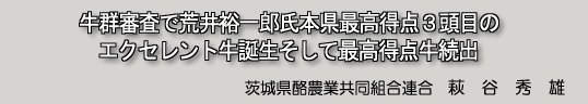 平成14年度後期牛群審査及び後代検定体型調査を、2月17〜2月28日の12日間実施致しました。今回は、牛群審査の受検戸数が20戸・審査頭数313頭と改良委員会の委員を初め優良牛導入者の協力により受審戸数・頭数とも大幅な増加となっております。昨年より牛群審査においてVG牛(85点以上)が少しづつ出るようになってきており、本県エクセレントが、前々回・前回に続き誕生いたしました。 また、今回も若齢での高得点牛が続々と出現してきており、過去の導入事業等の成果が徐々にではありますが確実にでてきております。 今回も前回に引き続き、茨城町弓荒井裕一郎氏が本県最高得点3頭目のエクセレント牛誕生(自家産2頭目)という快挙を成し遂げました。本牛は県内を代表するショウカウで1昨年の第12回関東地区共進会では優等賞2席入賞、また昨年の第6回全日本BWショウの成年級に出品され、3席に入賞するなど本県を代表するショウカウの1頭であり、今年の酪連情報新年号の表紙を飾った高体型の牛であります。 ![]() 本牛は1昨年の第12回関東共進会後の審査で、高得点を期待しましたが、泌乳後期のため87点にとどまりましたが、産次を重ね今回エクセレントの期待が持てる1頭でありました。平成9年8月2日に千葉全共出品牛を母に、その当時ショウ出品が多いブラウンデール スターダストを本会計画交配により誕生いたしました。未経産牛時は子宮の状態が悪く初産分娩が遅れてショウにデビューいたしました。岡山全共への最終出品選定まで残りましたが、本人に最終候補牛が2頭いたために、岡山全共を辞退した牛でもありました。 |