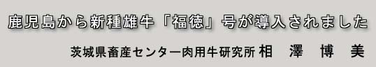 本牛の成績−体型審査 本牛「福徳」も、鹿児島県でのすばらしい実績を引っ下げて茨城にやってきました。父親譲りの体型は、87.0という高得点です。本県繁殖牛の欠点として多く指摘のある前駆は、巾、深み、充実どれをとっても非の打ち所がなく、前駆の改良を強力に進めてくれるものと期待しています。前駆の優点は、そのまま中躯、後躯へと移行し、これらも「福徳」の優れた点として上げられます。更に、資質が良く、今まで本県では見ることが出来なかったような皮膚の薄さ、ゆとり、弾力性を持っています。繁殖牛群の体型のワンランクアップに大いに利用して頂きたいものです。