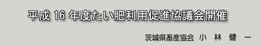 去る8月25日、平成16年度茨城県たい肥利用促進協議会(会長 廣木ュ茨城県畜産協会長)を茨城町のJA全農いばらき農業機械総合センター研修室において開催しました。当協議会は、たい肥センターにおける良質たい肥の生産、流通、利用の促進を目的に平成13年に設立され、各地域のたい肥センター(平成16年3月現在170)、農業団体、市町村、県を構成員としています。11月1日から本格施行される「家畜排せつ物の管理の適正化及び利用の促進に関する法律」に目前に控え、関係者多数出席のもと開会しました。![]() 主催者として矢口県畜産協会専務、来賓として県畜産課和田技佐より挨拶があり、その後協議に入りました。まず、事務局より事業報告と事業計画を提案しました。 |