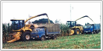 美野里町酪農組合は、昭和38年の組合設立当初よりコントラクター事業に取り組んできました。現在4条刈りの自走式ハーベスターを2台保有しています。我々組合員はトウモロコシ・ソルゴー混播の圃場を年間延300haの刈り取りを組合へ委託しています。