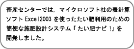 肥効率を考慮し,たい肥からの肥料成分を適正範囲内に調整するための施肥設計はとても複雑です。そこで,畜産センターでは,マイクロソフト社の表計算ソフトExcel2003を使って,たい肥利用のための簡便な施肥設計システム「たい肥ナビ!」を開発しました(図2)。