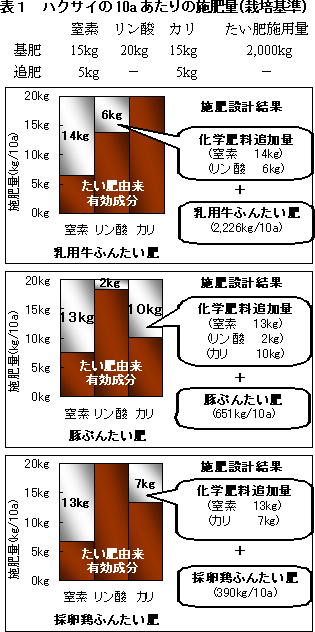茨城県野菜栽培基準におけるハクサイ(秋まき中晩生)の施肥量は表1のとおりです。乳用牛ふんたい肥・豚ぷんたい肥・採卵鶏ふんたい肥(各県内平均値)の施肥設計結果は図4になります。施肥設計を行うと,減肥だけでなく化学肥料代の削減にもなります。