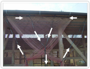 既に野生動物の侵入を金網で防いでいましたが、網目が大きいため(5角)スズメが侵入していました。そこで金網の外側に漁業で使用しなくなった廃棄漁網(網目2角)を防鳥ネットとして設置しました。漁網は十分な大きさがあるため屋根の高い鶏舎でもゆったりと覆うことができます。漁網の入手は漁業協同組合と交渉しました。この方法は、水産業が盛んな本県の特色を生かした低コストでネットを設置する有効な手段と考えられます。