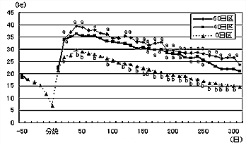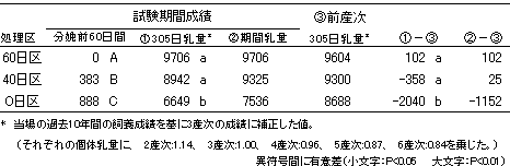 また,0日区の分娩後の乳量の推移は全期間を通じて低く,60日区に対して泌乳期間全般で,40日区に対して泌乳中・後期に差がみられました。