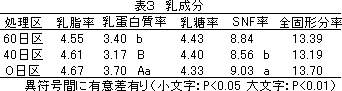 表3に示しました。乳蛋白質率,SNF率は0日区が他の2区に比べ高かったが,遺伝能力的に乳蛋白質の高い牛が偏ったためと考えられました。