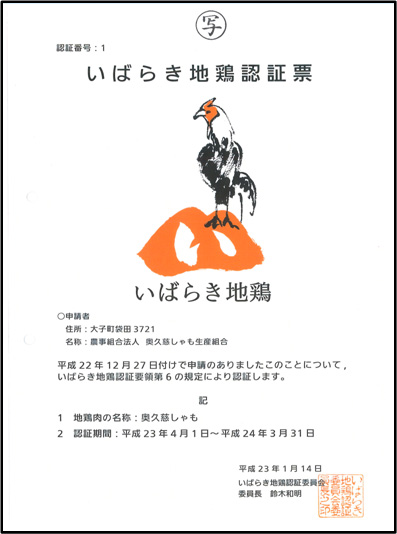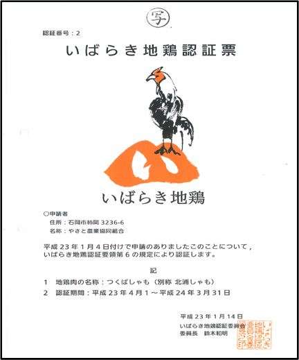平成23年1月14日に開催されたいばらき地鶏認証委員会で、(農)奥久慈しゃも生産組合が生産する地鶏肉「奥久慈しゃも」とやさと農業協同組合が生産する地鶏肉「つくばしゃも」が「いばらき地鶏」として認証され、認証票が発行されました。