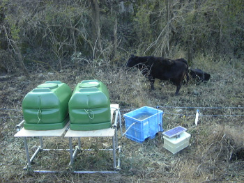 肉用牛研究所では水を500gの農業用タンクで運搬し、容器に移し替えて飲ませています。泥濘化防止及び水質保全のため、農業用タンクとフロート(止水弁)をホースで繋ぎ飲ませている例や水路から落差を利用して引水して飲ます例もあります。