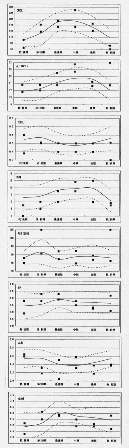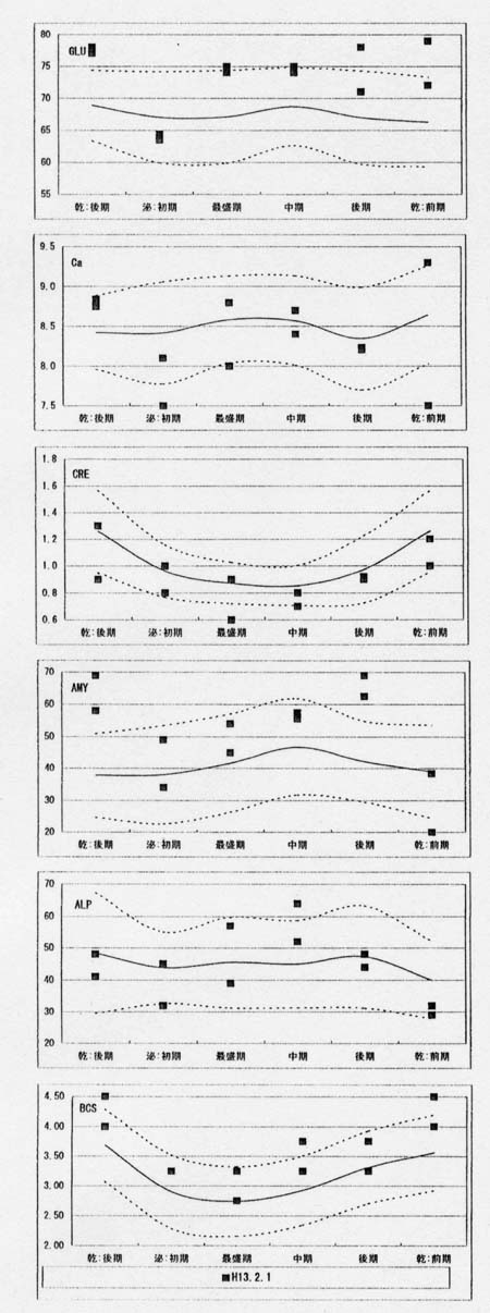 上のグラフがMTPの結果である。グラフ内の曲線は、平均値を実線、その上下に標準偏差を点線で表してある。故に、この点線の間が基準値(基本的に正常範囲内)である。グラフ上の「■」が酪農家Aの結果であり、横軸には乳期を示し、左から乾乳後期、泌乳初期・最盛期・中期・後期、乾乳前期としている。 泌乳牛群、乾乳牛群を通して大部分は基準値にあり、基本的に良好な飼養管理が反映されていた。 しかし、泌乳牛群全体にALB(総合的な栄養摂取状況の反映、特に蛋白質)、 |