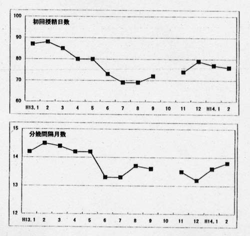 CHOL(総合的な栄養摂取状況の反映、特にエネルギーや脂質)、BUN(採食量の反映)は若干だが低値であった。 特に、泌乳初期ではこの状態が顕著であり、GLU(エネルギー摂取状況の反映)もまた低値であった。 酪農家Aは乳量を計測していなく、TMRの一群管理のため、この乳期を計測していなく、TMRの一群管理のため、この乳期の高泌乳牛が栄養不足に陥っていると考えられた。 繁殖成績を検討すると、初産、経産牛ともに空胎日数が長く、分娩間隔の長期化は泌乳後期から乾乳期においての過肥を生じていた。また、乾乳牛群においてもCHOL、BUNが低値であり、これは穀物や脂質の給与不足と考えられた。 以上の結果を参考とし、大幅な飼料変更は実施せず、酪農家Aの可能な範囲で対策をとった。泌乳牛群においては若干の粗飼料不足であり、「負け牛」でも採食可能にする目的で、絶対的な乾物量を上げるために1種類の乾草を1.5から3.0sに増量、栄養不足の改善のためTMRを給与してから、高泌乳と思われる牛に対して泌乳期用配合飼料1〜2sのトップドレス(個別)給与を実施した。 乾乳牛群では、基本的に乾草類を中心とした給与を行い、前期は乾乳期用配合飼料を添加し、後期は分娩前後の飼料の急変を防ぐために、分娩前20日位から泌乳期用MTPのリードフィード(馴致)給与を実施した。また、この乳期の過肥牛に対しては、定期的に強肝剤の飼料添加を行った。 以下に示すグラフは、酪農家Aの繁殖検査の結果である。若干ではあるが、飼養管理の改善が繁殖成績に反映されているように思われる。今後も酪農家Aや酪農組合の獣医師と協議し、繁殖や産乳成績向上のため飼養管理を観察していきたい。