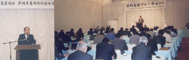 平成15年3月25日(火)友部町「友部グリーンビュー」において「茨城養豚フォーラム2003」が開催されました。 当日は雨の中、生産者を中心に76名が参加し、午前中は茨城県農林水産部 吉田畜産課長より「当面する本県養豚の課題」と題し、本県における畜産の動向、畜産環境保全対策、15年4月より新しく始まる家畜防疫互助事業の概要について講演を頂き、午後は全国養豚協会 尾形常任理事より「最近の養豚情勢と生産者の組織つくり」と題し豚肉の需要をめぐる状況とWTO農業交渉、生産者による組織つくりについて講演を頂きました。その後の意見交換会においては新しい互助事業、畜環リース等に関する質問や、生産者による組織つくりの必要性など活発な意見交換が行われました。 本県は大消費地に近いなど立地的にも恵まれており、これまで茨城県産の豚肉について生産者が特に組織的な活動等でPRしなくても比較的優位に販売できたと思います。 |