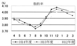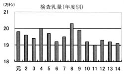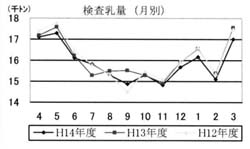 当協会では畜産物の品質向上を図る事業として、牛乳及び乳製品等の原料となる茨城県内で生産された原料牛乳(生乳)の成分的・衛生的乳質について検査を実施している。以下に示す成績は、生産者団体と乳業者との生乳取引に係る平成14年度工場合乳検査成績を集計した。なお、その検査サンプルは県内乳業工場へ出荷した生乳については月間12日間(旬4日)の工場受乳時タンクローリー単位に採取した検体、更に県外乳業工場に出荷した生乳については組合又はクーラーステーションから送乳される当該工場への送乳時タンクローリー単位に月間3回(旬1回)採取した検体とした。 1.検査乳量 酪農を取り巻く厳しい環境や後継者不足等により酪農家戸数及び飼養頭数が減少し、検査乳量は平成8年度の20万2千トンをピークに年々減少の一途をたどり、12年度には一旦回復はしたもののBSE等の影響等もあり14年度は19万1千トンとなった。季節別にみると夏から秋にかけて減少し、冬季は例年より300トンから500トン少ない乳量となった。 ![]() ![]() 1)乳成分 乳成分の検査は光学式乳成分測定機(ミルコスキミルコスキャン)を使 用し、加重平均をとり集計した。 @脂肪率 平成14年度の脂肪率は、11月以降すべての月で4%を超え12月が最も高く4.077%(前年度12月4.046%)、最も低かったのは前年度と同じく8月の3.734%(前年度8月3.767%)であった。また、前年度と比較すると8月から10月に低くなったものの11月以降はすべての月で0.03〜0.05%高く推移した。 ![]() |