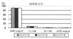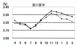 A無脂固形分率 無脂固形分率は、11月が最も高く8.761%(前年度11月8.760%)、最も低かったのは7月の8.535%(前年度7月8.551%)であったが、1月以降に例年では下がる傾向がみられるが今年度はほぼ同じ値で推移し、3月には前年度に比べ0.09%高くなった。 ![]() 蛋白質率は、11月が最も高く3.348%(前年度11月3.316%)、最も低かったのは7月の3.123%(前年度7月3.116%)であった。また、前年度と比較すると8月まではほぼ同じように推移したが9月以降すべての月で高くなった。 ![]() 体細胞数の検査は蛍光光学式体細胞数測定機(フォソマチック)を使用し、乳成分と同じ検体を使って同時に検査した。 ![]() 3)細菌数 細菌数の検査方法は直接鏡検法(ブリード法)により月間3回(旬1回)実施し、採取した検体をスライドグラスに塗末染色し検査した。集計は県内・県外乳業工場分の成績を算術平均して行った。 平成14年度は各月とも4〜7万/mlで推移し年度平均値は6万/mlとなった。過年度を見ても14年度と同じように細菌数は少なく4〜8万/mlの範囲で推移している。 細菌数の分布は全検体の90%以上が10万/ml以下のランクになっているが、21〜30万/ml、 31万/ml以上のランクにも若干の発生がみられた。 |