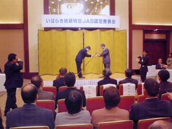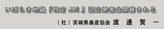 いばらき地鶏振興協会(中島光一会長)主催による、特定JAS地鶏肉の認定発表会が平成15年12月4日、水戸プラザホテルにて、関係機関・消費者団体・報道機関等、約80名が出席し行われた。 今回、当畜産協会より「農林物資の規格化及び品質表示の適正化に関する法律:JAS法」に基づく「認定生産行程管理者」並びに「認定小分け業者」として、八郷町農業協同組合・(有)共栄ファームが認定を受けました。 認定生産行程管理者に認定されたことにより、地鶏の飼育過程から食鳥処理まで行い、特定JASマークを付することが出来ることなった。生産される地鶏肉の名称は、「やさとしゃも(別称、北浦しゃも)」・「筑波地鶏」である。 |