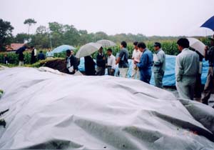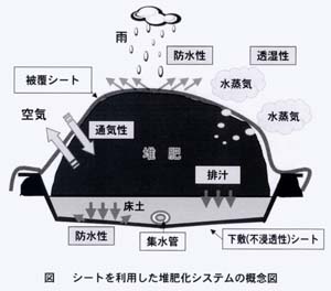 5)堆肥化材料の水分調整と搬入・堆積 家畜排せつ物と副資材を混合し、水分を牛ふんの場合約70%以下。豚・鶏ふんの場合約60%以下とし、各々容積重700Kg/m3以下を目安に調整し、堆積する高さは概ね1.5m程度とする。 6)通気管やブロアーの設置 通気管を設置する場合は、暗渠管を堆積する山の長辺に対し直角に設置し、両端は山の外側に解放する。 7)被覆シー卜の設置と固定 @窪みができないよう堆積した山を成形する。 A被覆シートで堆積した山を覆う。 B古タイヤ、土のう、マイカー線、防鳥網、園芸用ネット等でシートを固定する。 ![]() 1)水分調整(容積重の調整) 副資材を混合し、容積重で700kg/m3以下に調整する。 2)通気 被覆シートは通気性や透湿性の素材や微細孔付きの素材が市販され、堆積表面の好気発酵が可能とされているが、堆積した内部の好気発酵は不十分となる。通常の堆肥化施設で行う切り返し、機械攪拌、強制通気などの方法は構造やコスト面で事実上不可能である。 @ローダーによる切り返しは、よう壁がないので作業が難しい、下敷シートが痛む等の問題点がある。 A暗渠管設置による通気の効果は暗渠管周辺に限られる。 Bブロアーによる通気は、通気の効果が十分期待できる。ブロアー設置関連費用がかかり、電源が必要なため、設置場所が畜舎周辺などに限られる。 3)排汁の処理 堆肥化初期では、太陽熱や発酵熱による蒸散が少ないため排汁が大量に出る。このため集水管を設置し、排汁を貯留槽に貯留する。 4)雨水の流入防止 雨水が流入しない高い場所に設置するか、設置場所の廻りに雨水流入防止用の土手を設置する。また、被覆シートは必ず不浸透性シートの外側まで設置し、雨水が堆積した山の上に貯まらないよう凸状に被覆する必要がある。 5)風対策 被覆シートが風で煽られると、堆肥に雨が当たり野積み状態となり、また、シートが破れやすくなるため風対策が必要となる。被覆シートの固定には以下のような工夫がされている。 @古タイヤ・土のうによる固定。 Aマイカー線やロープによる固定。 B防鳥網・園芸用ネットによる固定。 5 設置規模の目安 必要となる敷地面積とシートの長さは、家畜排せつ物量、水分、混合する副資材の種類、堆積期間等によって決まる。参考までに、畜種別に必要敷地面積とシートの長さを示すと表のとおりとなる。 表 家畜一頭あたりの設置規模の目安
