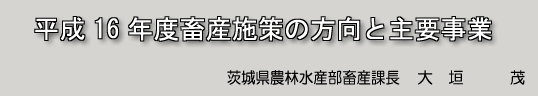 この度の人事異動により畜産課長を拝命いたしました。新年度にあたり改めて、新たな気持ちで、本県畜産振興のため、全力を尽くして頑張ってまいりますのでよろしくお願いいたします。 畜産をめぐる最近の情勢は、本年1月から3月にかけて、国内では79年ぶりとなる高病原性鳥インフルエンザの発生が確認され、感染拡大への懸念と、人への感染も否定できないことから、畜産関係者のみならず国民をも巻き込み、大きな社会問題となりました。 その後の発生につきましては、発生県・関係機関の懸命な防疫措置により、感染の拡大はくい止められ沈静化の状況にありますが、感染経路につきましては、いまだに解明されていないことから、生産者、消費者及び防疫に係る関係者の不安は払拭されていない状況にあります。 また、国際情勢を見てみますと、昨年末のアメリカにおけるBSEの発生確認に端を発した牛肉の輸入の一時停止措置の発動、それに続く東南アジアでの鳥インフルエンザ発生によるタイ・中国等からの鶏肉の輸入停止措置、さらにはメキシコとのFTA協議が合意したことから、同国からの豚肉輸入には、関税の半減枠が設定されるなど畜産を取り巻く環境がめまぐるしく変化してきております。 一方、県内の農業情勢につきましては、担い手の高齢化、耕地利用率の減少などに加え、消費者ニーズや流通形態の多様化など社会構造が変化していることから、茨城農業のさらなる発展を図るため「消費者のベストパートナーとなる新たな茨城農業の確立」を目指し、抜本的な茨城農業改革に取り組んでいるところでごさいます。 畜産におきましても、この改革の一環として銘柄畜産物のブランド力の更なる向上を目指し、本年度新たに常陸牛を重点とした、生産から販売までを見据えた対策の実施に取り組んでまいるところでございます。 本年度取り組みます畜産施策につきましては、@生産基盤の増強A畜産経営の体質強化B安全な畜産物の生産C畜産環境対策の充実D試験研究の推進と指導体制の充実を大きな柱とし、以下の対策を推進してまいります。 生産基盤の増強対策につきましては、家畜改良による生産能力の向上に努めるとともに、水田を活用した飼料作物の増産を促進し、飼料自給率の向上のための取り組みを進めてまいります。 |