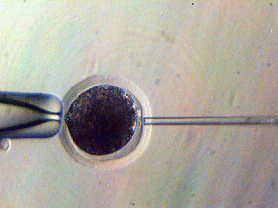 除核した卵子の細胞質へドナー細胞を注入します。ピエゾ式マイクロマニュピレータという器械をもちいて顕微鏡下で操作します。