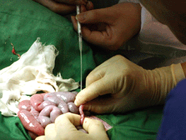 2日ほど培養したクローン胚は、当センター養豚研究所で飼養していた代理母豚(受胚豚)に移植されます。ホルモン処理により代理母豚の発情周期をクローン胚と同期化しておきます。そして、発情後2日目にクローン胚を1頭あたり100〜200胚移植します。牛のように体外での培養が確立していて、胚盤胞まで発育した胚を開腹手術無しに子宮に移植できるなら簡単ですが、豚の胚は体外培養が難しいため、2細胞から4細胞に発育した早い段階で全て卵管に移植しているのです。