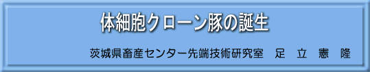 当センターでは、上記の遺伝子操作を行わない1、2の利用法を目指して、平成14年度から畜産センターとプライムテック株式会社(土浦市)の共同研究として体細胞クローン豚の生産の予備試験を実施してきました。プライムテック社がクロ