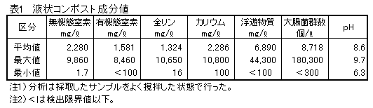 茨城県内の養豚農家60戸について、処理方法や成分の調査を行った結果を見てみると固液分離に関しては、全く分離していない農家が2戸ありましたが、多くは畜舎内で分離するか、畜舎外の機械で行うか、何らかの形で固液分離を行っていました。曝気処理に関しては曝気なしが1戸、間欠曝気が12戸、連続曝気が46戸ありました。ほとんどの農家が何らかの処理を行っており、液状コンポストとみてよいと思います。ただ、性状や成分値については幅が非常に大きく(表1)、これが肥料としての利用を妨げる要因の一つとなっています。