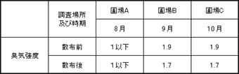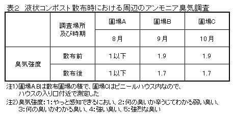 臭気に関しては独特の排せつ物臭は十分な曝気によって低くすることができます。また、散布する時の畑の周囲での臭気について当センターで測定した結果、散布の前後で臭気強度の違いはほとんどありませんでした(表2)。さらに散布後速やかに土壌で被覆すれば臭気はまず気にならないと思います。液状物の畑への散布に対して排せつ物をそのまま散布するイメージがあり、液状物の散布=臭いという意識が強いので、常に適正な処理を心掛ける必要があります。