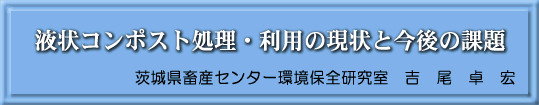 家畜排せつ物の管理の適正化と利用の促進を柱とする、いわゆる「家畜排せつ物法」の施行に伴い、家畜排せつ物の処理・利用方法について改善が強く求められています。固形物に関してはたい肥化が最も一般的な処理方法であり、処理と利用は関連づけて検討されてきています。一方、液状物に関しては浄化・放流が一般的な方法です。しかし、茨城県では霞ヶ浦流域のように水質基準に上乗せ規制をかけている地域が多く、個々の農家で水質基準に対応するのは困難な状況であり、不適切な処理・利用による環境への負荷が懸念されます。そのため環境への影響を考慮した、浄化・放流以外の利用方法について検討する必要があります。考えられる方法は、やはり肥料としての利用です。液状物の肥料としての利用については、飼料生産圃場では行われていますが、耕種農家での利用を前提とした、液状物の処理や利用方法について詳しく検討した例は多くはありません。そこで、当センターではまず利用の前段階として、液状物の成分の調査、曝気処理による成分の推移等についての試験を行ってきました。その結果をふまえて、液状物の処理・利用の現状について報告します。