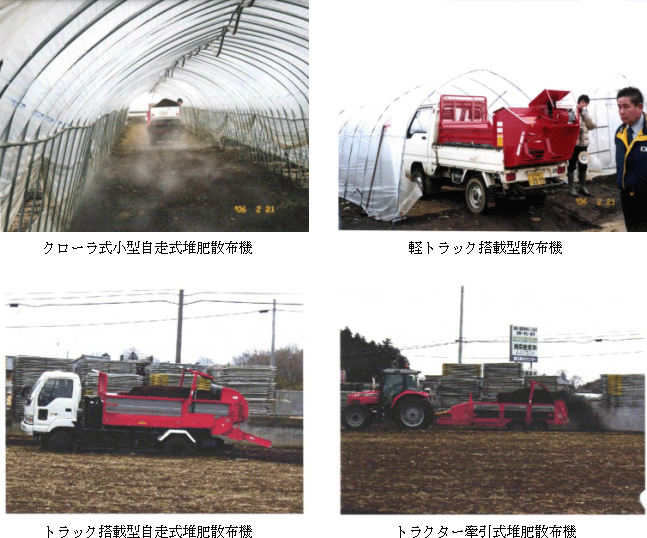 実演会では、施設野菜栽培に対応できるクローラ式の小型自走式堆肥散布機や路地野菜栽培等に対応できるトラクター牽引式堆肥散布機のデモンストレーションを行いました。また、会場では、軽トラック搭載型散布機やダンプトラック搭載型の自走式堆肥散布機の展示も行われました。