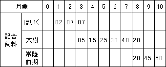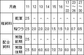 放牧区は牛舎と自由に出入りできる5種混播の草地43aを,舎飼区は25.01u(4.1m×6.1m)の牛房で群飼を行いました。両区ともチモシー乾草を飽食とし,濃厚飼料は全農茨城県本部の子牛育成マニュアル(表1)に従い給与しました。また,肥育期は全農茨城県本部の肥育マニュアル(表2)に従い給与しました。