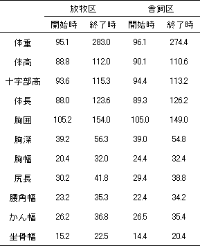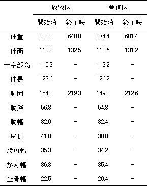 育成試験終了時の1日当り増体量は放牧区0.91kg,舎飼区0.85kgで,体重,体高,十字部高,胸囲,胸深,胸幅,尻長,腰角幅,かん幅,坐骨幅の部位で増加量は放牧区が舎飼区を上回ったが,いずれの項目も両区に有意差は認められませんでした(表3)。