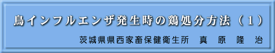 鳥インフルエンザについては,これまで鶏肉や卵を食べることによって人に感染したという事例の報告はなく,今回のウイルスは弱毒タイプでしたが,鶏へのまん延及び常在化を防ぐとともに,将来強毒タイプに変異する怖れもあることから感染鶏の処分作業を行いましたので,殺処分についてその概要を報告します。