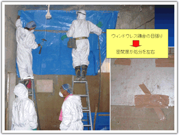 一例を紹介すると,炭酸ガスは1m3あたり1.6s鶏舎内に注入しましたが,予め鶏舎はガスの漏出を防ぐために換気扇や排気口の目張りを行った他,ガス注入前の確認で鶏舎にあいた穴も,粘着テープ等で塞ぎました(図5)。