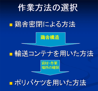 そして,その方法における第一の選択肢としては鶏舎密閉による方法を検討し,それが不可能であると判断された場合は輸送コンテナを用いた方法を,さらに鶏舎構造や資材・作業場所の確保等でそれも難しい場合には,汎用性の高いポリバケツによる方法を選択すべきであり,またはこれらの方法を組み合わせて,より効率的な作業形態のフレキシブルな選択が重要であると思われました(図7)。
