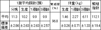 育成率 3週齢までの育成率は96.8%であり、死亡した子豚は1腹平均0.3頭とかなり少ないものでした。
