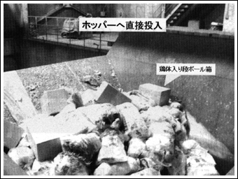 焼却場では、段ボール箱の破損を懸念してゴミピット(一般ゴミを一時保管する場所)ではなくホッパー(焼却炉へ直接投入できる場所)へ直接投入しました(図14)。また、投入(焼却)量は、炉の過熱を防止する意味から、一般ゴミの10〜15%の量を、一般ゴミに混ぜて焼却しました。よって一般のゴミ量が多く焼却施設の能力を超えるときばかりでなく、一般ゴミの搬入量が少ない場合にも焼却施設を活用できない事例もありました。