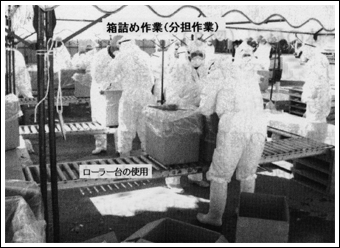 この箱詰め作業は(図13)、作業場所も限られており、また鶏を8〜10羽入れた箱は重く、効率よく作業を行うためには@段ボール箱を組み、ビニール袋を掛けておく係 A鶏体を袋に入れる係 B袋を閉じる係(結紮バンド使用)C段ボール箱を閉じる係 D箱をパレットに重ね、ラッピングする係等に分かれて効率的に作業ができるよう工夫しました。また、ローラーコンベアーが活用できた農場ではより一層の作業の効率化が図られ、作業従事者の負担も軽減化されました。