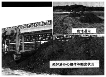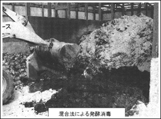 鶏体、鶏糞、おがくずを1:1:1に混ぜ合わせる混合法によるもので、堆肥舎に運び込まれた鶏体等はローダーにて均一に撹拌しながら(図9)、堆肥舎に約2メートルの高さに積み上げ、おがくずで覆った上に石灰をかけて、さらにビニールシートで覆い、ウイルスの拡散を防ぎました。