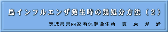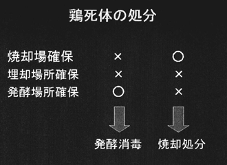 鳥インフルエンザについては、これまで鶏肉や卵を食べることによって人に感染したという事例の報告はなく、今回のウイルスは弱毒タイプでしたが、鶏へのまん延及び常在化を防ぐとともに、将来強毒タイプに変異する怖れもあることから感染鶏の処分作業を行いましたので、死体の処理についてその概要を報告します。