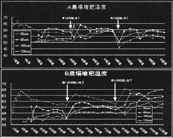 発酵(図10)により1回目の切り返し時点で、すでに鶏体等も殆ど識別不能な程度まで分解しており(図11)、ウイルス分離も陰性でした。しかしB農場は、鶏舎内に非常に水分含量の多い鶏糞が多量に堆積していたこと、ウイルス飛散防止のため、石灰やビニールシートで表面を覆ったことが重なり酸素不足になったことで発酵温度の上昇が十分に得られない測定場所がありました。そこで、ウイルスの周辺への拡散を未然に防止するため、1カ月間隔で2回の切り返しを行い、約3カ月間の発酵消毒を行ったところ、良質の堆肥となり農地還元できました(図12)。