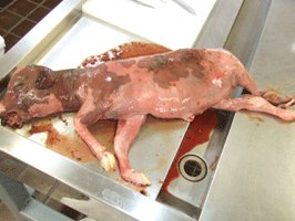 A酪農家で平成19年3月,流産が発生し,この流産胎仔(写真1)を病性鑑定した結果,牛ウイルス性下痢・粘膜病(以下,BVD-MD)による流産と診断しました。A酪農家内に持続感染牛が存在し感染源となっている可能性があるため,汚染状況の調査及び持続感染牛を摘発する目的で農場内全頭の血液検査を行いましたが,持続感染牛は摘発されませんでした。これにより,農場外部からのウイルス侵入の可能性を考え,同じ酪農地域全体の汚染状況を調査するために,地域酪農家全7農場を対象としてBVD-MDに関するアンケート調査を行いました。その結果,流産の発生や,虚弱仔牛の娩出が地域全体で起こっていることが分かりました。そこで搾乳牛の中にウイルスを排出しているものがいるかを調べるため,バルク乳検査を行いました。検査の結果,B酪農家1戸で,バルク乳検査陽性となりました。