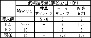肉用交雑種の8ヶ月齢(導入時月齢)〜12ヶ月齢に対して,現物あたりチモシー5kg/日・頭と稲WCS2.2〜4.5kg/日・頭を給与(稲WCSの購入量により変化)しています。稲WCSの嗜好性はとても良く,見かけの増体も問題なく発育しています。稲WCS給与牛の初出荷はH20の夏予定となっています。