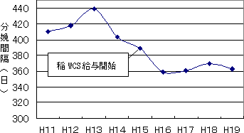 平成15年に稲WCS給与を開始してから,給与量の増加に伴い,初産月齢も22.5ヶ月齢(H15)から22.2ヶ月齢(H18)と早くなり,分娩間隔も給与開始時の389日(H15)から363日(H19)と短縮されています(図1)。