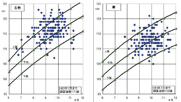 育(体高)を調査した結果を図に示しました。雌