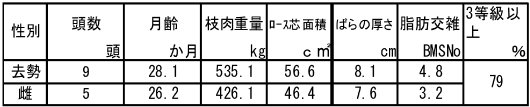 交雑種では、14頭の枝肉情報を収集し、5頭