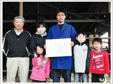 協会主催の枝肉共励会としては、東日本大震 災・原発事故以来となりました。風評被害や汚染さ れた稲ワラ給与問題で、一時は牛枝肉価格は大暴 落となり、生産者をはじめ関係者一同大変な思い をいたしました。それだけに今回、復活に向けた思 いは皆な強いものがありました。 ![]() 名誉賞の中嶋牧場ファミリー