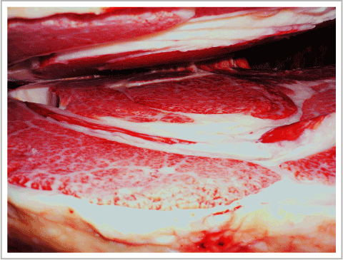 どの牛も常陸牛としての、使命感を果たそうと決 意が感じられました。また、当日参加された生産者 は名誉賞と最優秀賞候補牛を真剣なまなざしで選 び投票していました。 3月2日に枝肉審査が早朝から行われ、県肉牛 研究所の宮部所長を審査委員長に、日本格付協 会・東京食肉市場・JA全農ミート・潟Rシヅカ社長 が審査に当たりました。 慎重なる審査の結果、名誉賞には常陸大宮市 の拠島牧場さんの去勢牛「久茂栄」号と決まり ました。枝肉重量524kg、ロース芯面積98cm2、BMS12の堂々たる立派な常陸牛でした。 最優秀賞には同じく常陸大宮市の旧纉。牧場さ んの「頼朝」号が選ばれ、内容も名誉賞に準ずる 肉質でした。販売単価の方は風評被害や景気低迷 の逆風の中、1頭当たりの平均販売金額は956,161円となり、ま た、平均販売単価は1,794円でした。平 均枝肉重量は533kg。 枝肉重量を除いていずれも前年を下回りましたが、 この時期としては大いに健闘をしました。また、 常陸牛刻印率(AB4等級以上)は前年の90%を 上回る94%となり、市場関係者からは注目され大 いに評価を高めました。 ![]() 表彰式