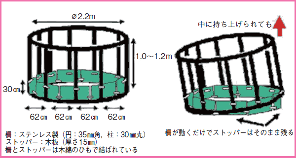 ロールベールを給飼柵に持ってくるのではな く,給飼柵の方をロールベールのところまで移 動させ,上から被せて使用します。 また,給飼柵の下部には,ストッパーがある ため,牛が稲発酵粗飼料を放牧地に引き込むこと がほとんどなく,効率的な飼料給与が可能です。 (問い合わせ先(独)中央農業総合研究センタ ー土壌肥料研究領域 TEL:029-838-7179) ![]()