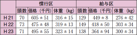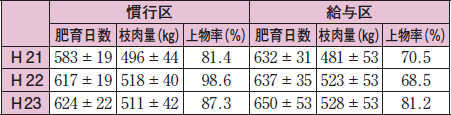 (1) 慣行区:JA 飼料給与マニュアル(粗飼 料:稲ワラ飽食,濃厚飼料:市販配合飼料, ビタミンA(VA)コントロール:24ヵ月 齢前後にて飼料添加剤等による暫時補給) (2) 給与区:JA 飼料給与マニュアルに準ずる が,VA 補給無し。H21年当初から,肥 育前期において稲WCS を3s給与開始 した。同年秋頃,肥育後期から出荷まで 稲WCS を2s追加給与した。 ![]()