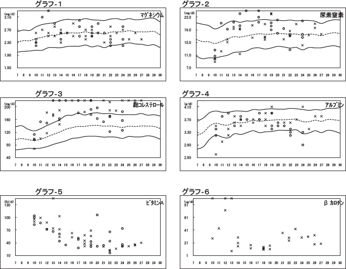 1) MPT(曲線内:肥育牛正常範囲,横軸:月