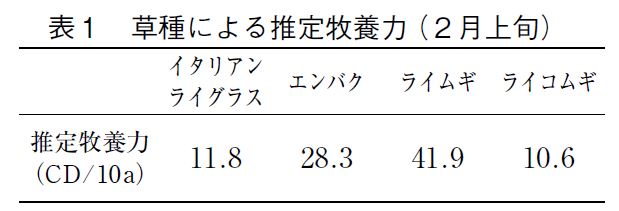 放牧地を冬季に利用するため,秋に放牧が終了した後に追播する寒地型牧草の草種及び追播時期,利用時期を検討した結果,10月中旬のライムギの追播が最も適していました(表1)。利用時期は1月中旬〜4月下旬まで1番草〜3番草まで利用が可能でした。