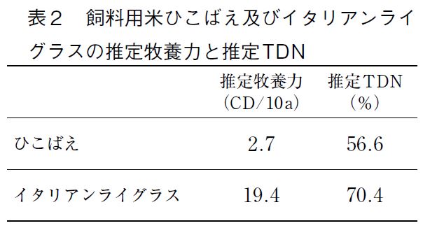 イネの種類では飼料米ひこばえが推定牧養力及び推定TDNとも最も高く,放牧利用には飼料米ひこばえが適していました。