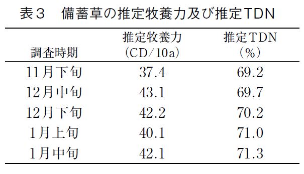 11月中旬以降については,霜により半ば枯葉状態(フォッゲージ)になりましたが,1月中旬まで推定牧養力は40CD/10aを維持し,成雌牛維持の必要成分量を満たしていることから,1月中旬まで放牧利用できることが示されました(表3)。